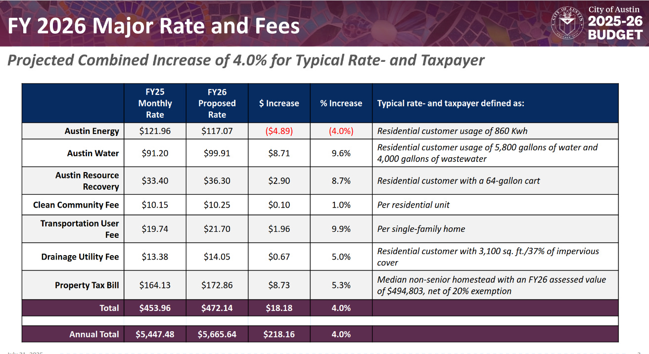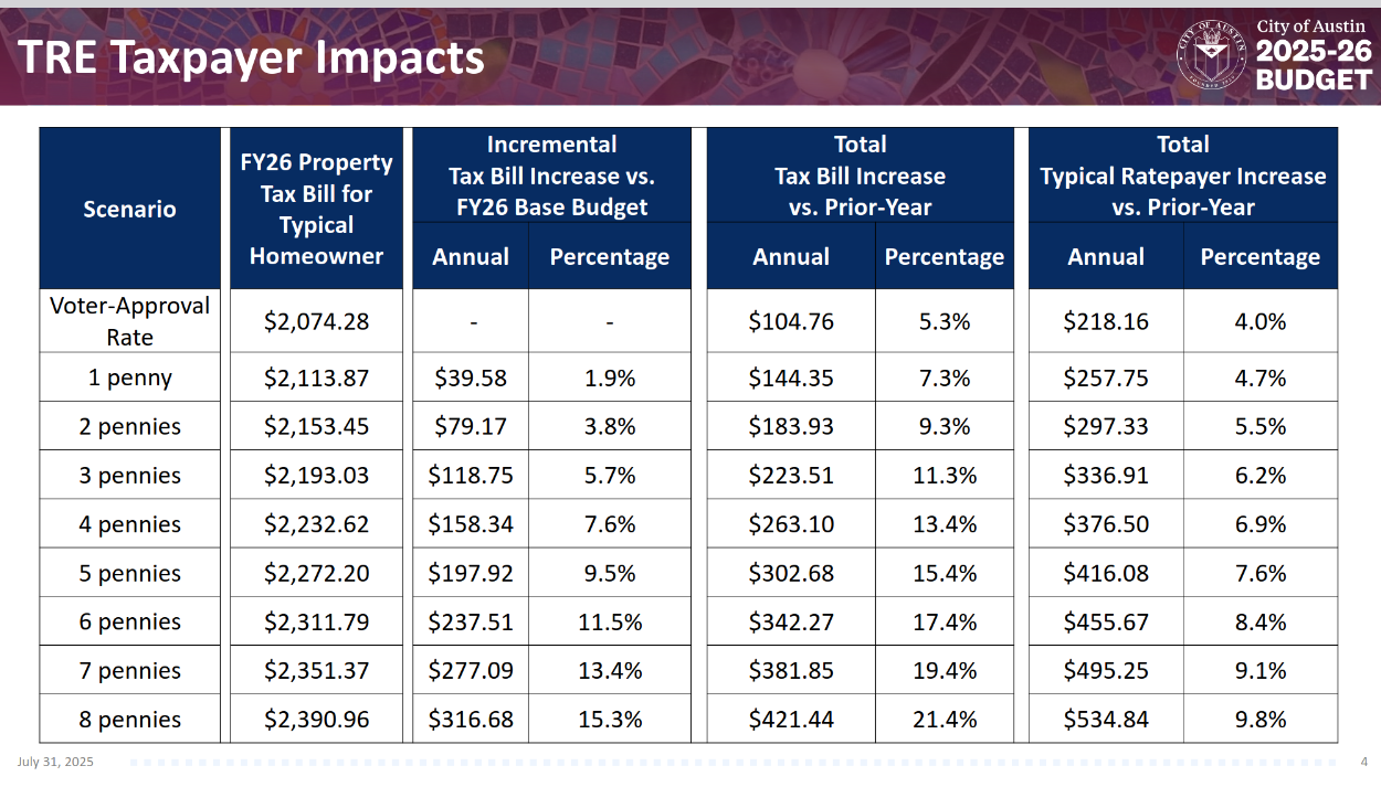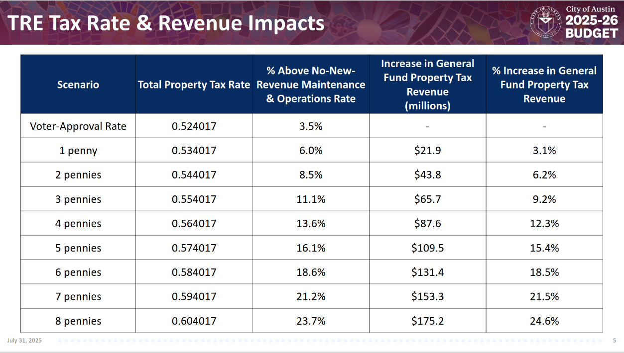 In case you didn’t want to listen to that video segment, the mayor took a motion to set the maximum tax rate that the council will consider on August 13-15 (should it take three days) at $0.604017 per $100 property evaluation and set a public hearing at 10am on August 13th as required by Texas state law to hear from the public one last time before council decides on the actual property tax rate for FY25-26. Note from the last table below that the maximum tax rate considered would include a voter approved tax rate election for an additional $0.08 per $100 property evaluation in addition to the 3.5% Texas statutory maximum rate set by law in 2019 beyond which a voter approved tax rate election is required.